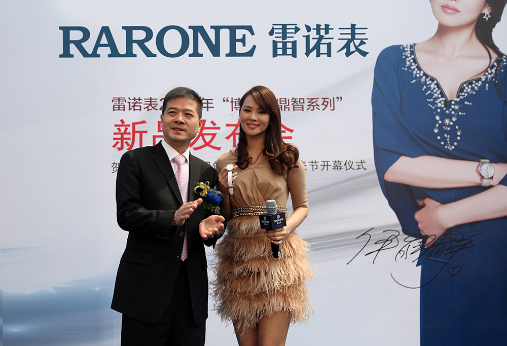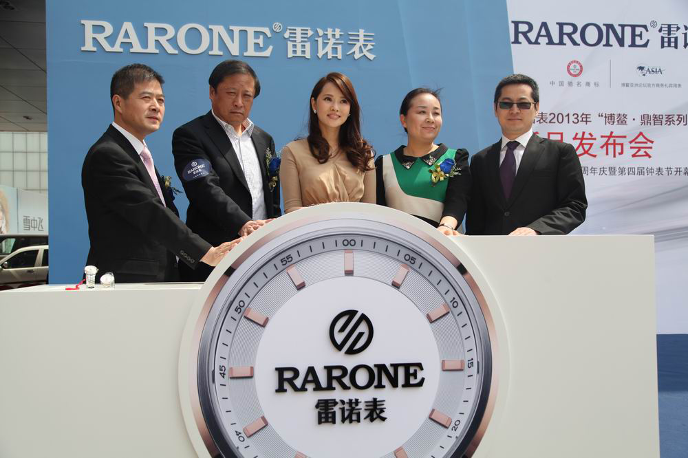 左起:雷諾表業(yè)總經(jīng)理詹江洲先生;唐百大集團董事、總裁王維柯先生、副總裁孟瑞軍女士;雷諾表業(yè)營銷總監(jiān)程兵先生與伊能靜一起為新品上市揭幕