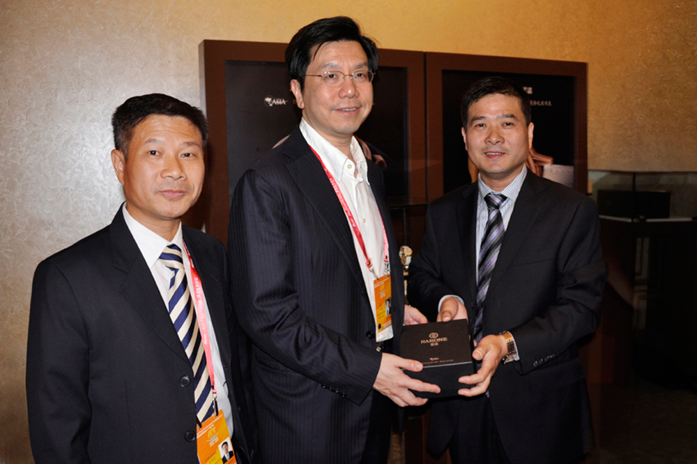 雷諾表業(yè)董事長詹西洲、總經(jīng)理詹江洲親自贈送博鰲紀(jì)念表予李開復(fù)博士(中),并合影留念
